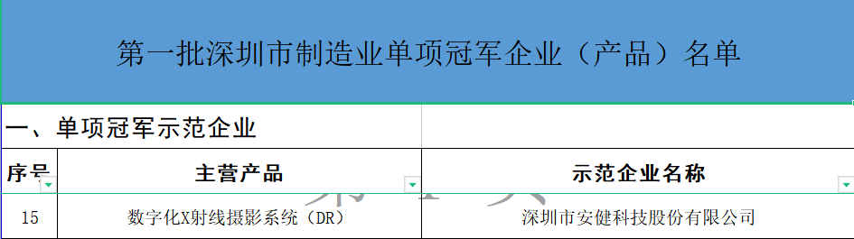 2023年1月6日,深圳市工业和信息化局公布《第一批深圳市制造业单项冠军企业(产品)名单》,388vip太阳集团科技凭借在数字化X射线摄影系统(DR)领域的技术创新与领先的市场占有,获评深圳市单项冠军示范企业。