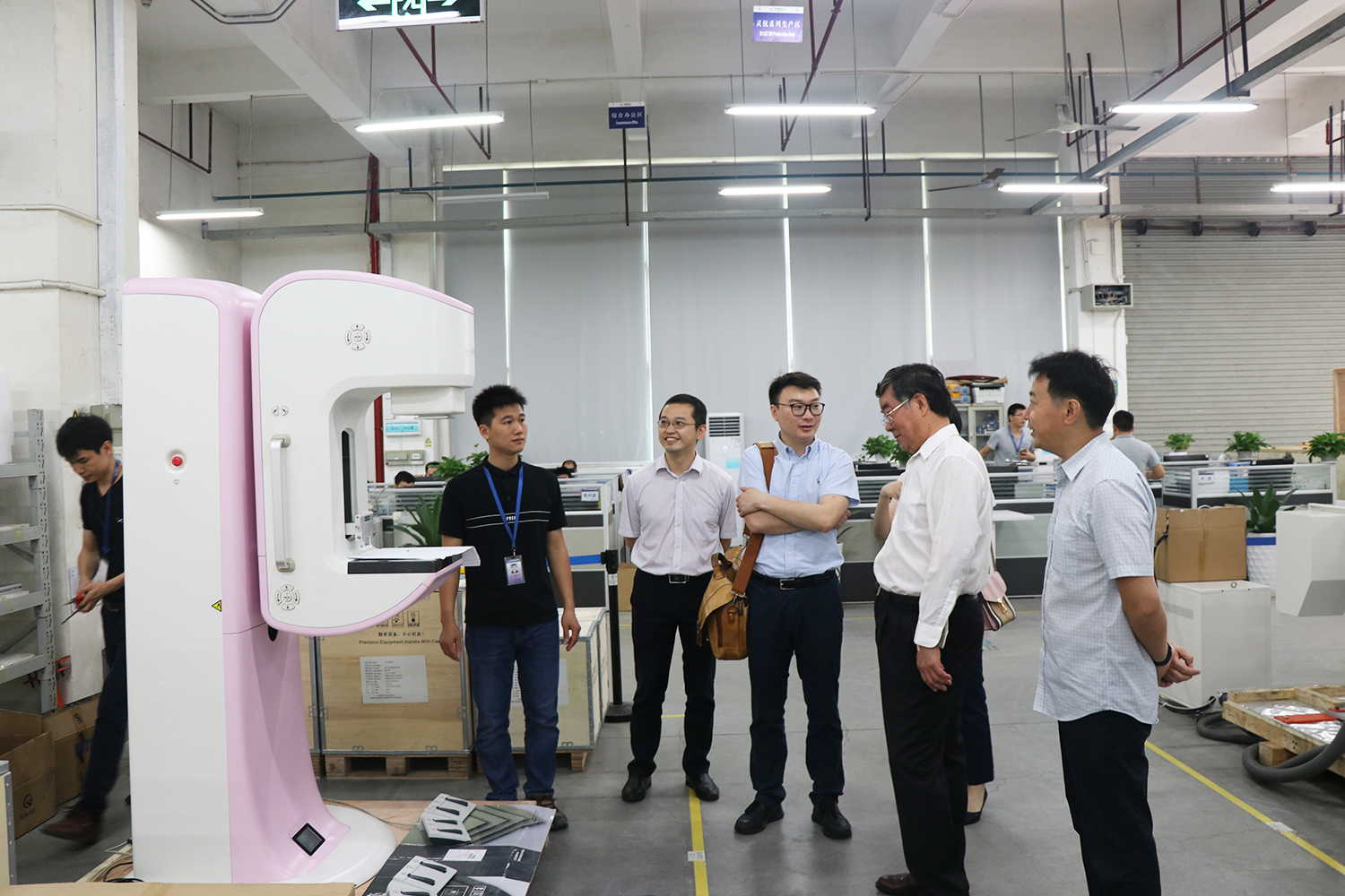 在公司领导的陪同下,中国医学装备协会副理事长王东升一行依次听取了公司介绍、动态DR产品介绍,参观了公司核心部件生产区及整机生产区。在参观讲解过程中,中国医学装备协会副理事长王东升一行对388vip太阳集团科技的产品创新力、丰富的企业文化以及井然有序的生产管理表示肯定和赞赏。